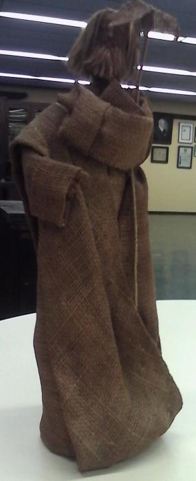 Peça que retrata homem de cabelo e barba longos, veste túnica e traz na mão uma espécie de livro e lança.