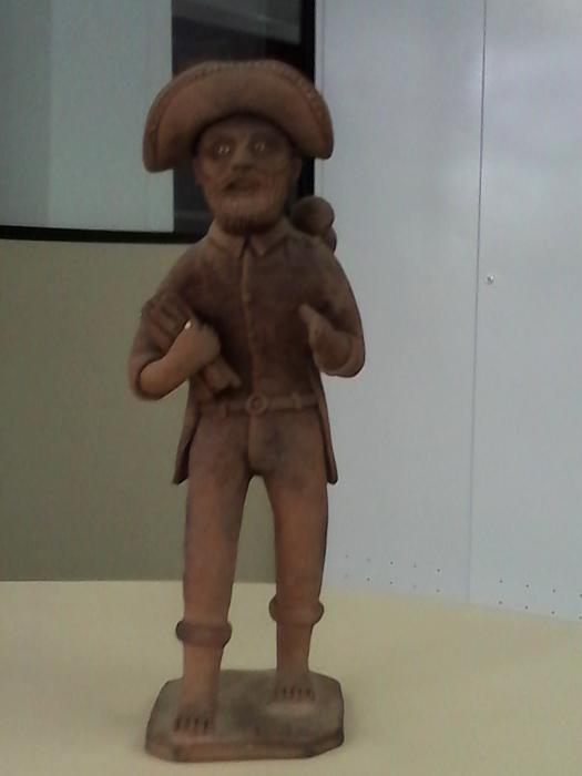 Peça que retrata homem com chapéu meia-lua, cuja aba frontal tem a orla pontilhada, apresenta barba e bigode, olhos pintados, usa camisa de botões com manga dobrada, está descalço; no braço esquerdo traz toros, sobre o ombro direito traz uma cabaça; na base lê-se: “EDOU”.
