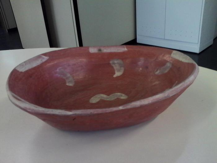 Peça arredondada, com borda alongada e pinturas abstratas e irregulares na face externa.