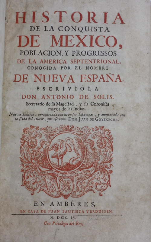 Abaixo do título: " Nueva edicion, enriquezida com diversas estampas, y aumentada com la vida del autor, que escrivio Don Juan de Goyeneche". Inclui índice. Ao final da folha de rosto: " Con Privilegio del Rey". Texto em colunas com duas páginas em cada folha. Marca tipográfica na folha de rosto. Presença de corandel, capitais ornamentadas, cabeção. Florão fundo de lâmpada e vinhetas em fio simples. Gravuras sobre a cidade, as batalhas travadas, e sobre o cotidiano: p. 26, 34, 139, 263, 266, 278, 310, 443, 459, 571 e 599. Mapas descritivos: p. 1 e 272. Ao final da obra consta as " licenças necessárias". Inclui página da "Censura del excelentíssimo Señor Don Gaspar de Mendonza Albañez de Segovia...Marquez de Mondejar."Dedicatória "Al Sereníssimo Señor Maximiliano Emanuel, Duque de las dos Bavieras, y Palatinado Superior, Conde Palatino Del Rhin, Archidapifer, y Elector del Sacro Romano Imperio". Cabeção com possível gravura de D. Antônio de Solis y Ribadeneyra acima do título: "Vida de Don Antônio de Solis y Ribadeneyra Oficial de la Secretaria de Estado, Secretario de Su Magestad, y Su Coronista Mayor de las Indias". Texto em espanhol.Marca de Propriedade: carimbo molhado da Biblioteca Frederico Edelweiss - Univ. Federal da Bahia. Exemplar com páginas danificadas : p. 46 e 553, 310 e 311, 406 e 407. Com marcador de página em cetim verde. Encadernação: pasta de papelão revestido em papel marmorizado e lombada decorada em dourado entrenervuras. Corte do livro decorado com mesmo padrão usado na folha de guarda. Folha de rosto escrita em cores vermelha e preta. Presença de Reclamo e Assinaturas.Localização da Obra: